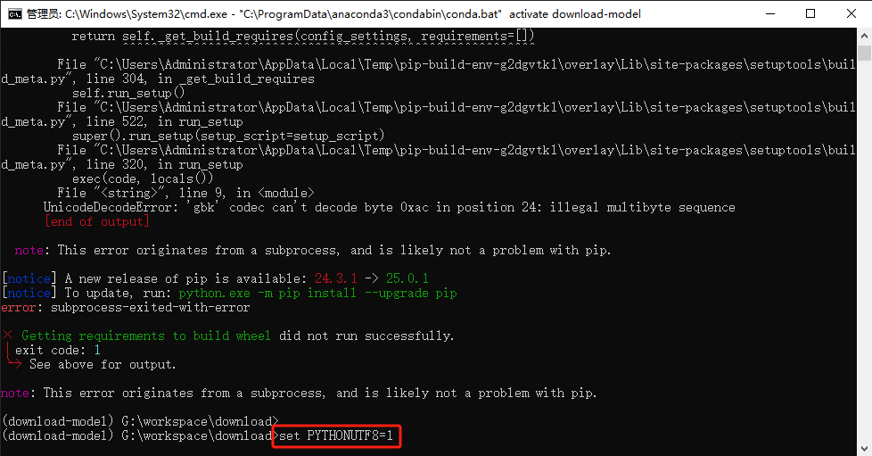 **解决方案:**选择python依赖包,用代码程序解决,使用pycrawlers这个python包,使用这个包可以轻松实现批量下载,以及进度显示。 **第1步:使用conda创建虚拟环境,执行以下命令:** conda activate download-model **第2步:设置编码编码方式,否则提示安装不成功,错误如下图所示:** set PYTHONUTF8=1 pip install pycrawlers  **第3步:创建huggingface_model_download.py文件,写入以下代码** # 此类用于下载Huggingface模型文件 from pycrawlers import huggingface # 实例化类 hg = huggingface() # 1.批量下载 #urls = ['https://huggingface.co/shibing624/text2vec-base-chinese/tree/main', # 'https://huggingface.co/ziqingyang/chinese-llama-2-7b/tree/main'] # 默认保存位置在当前脚本所在文件夹 ./ #hg.get_batch_data(urls) # 2.单个下载 #url = 'https://huggingface.co/shibing624/text2vec-base-chinese/tree/main' url = 'https://huggingface.co/sentence-transformers/all-MiniLM-L6-v2/tree/main' # 默认保存位置在当前脚本所在文件夹 ./ hg.get_data(url) # 自定义下载位置 # 多个不同位置 #paths = ['/home/model-gpt/chinese-llama-2-13b','/home/model-gpt/chinese-llama-2-7b'] #hg.get_batch_data(urls, paths) # 单一位置 #path = '/home/model-gpt' #hg.get_data(url, path)