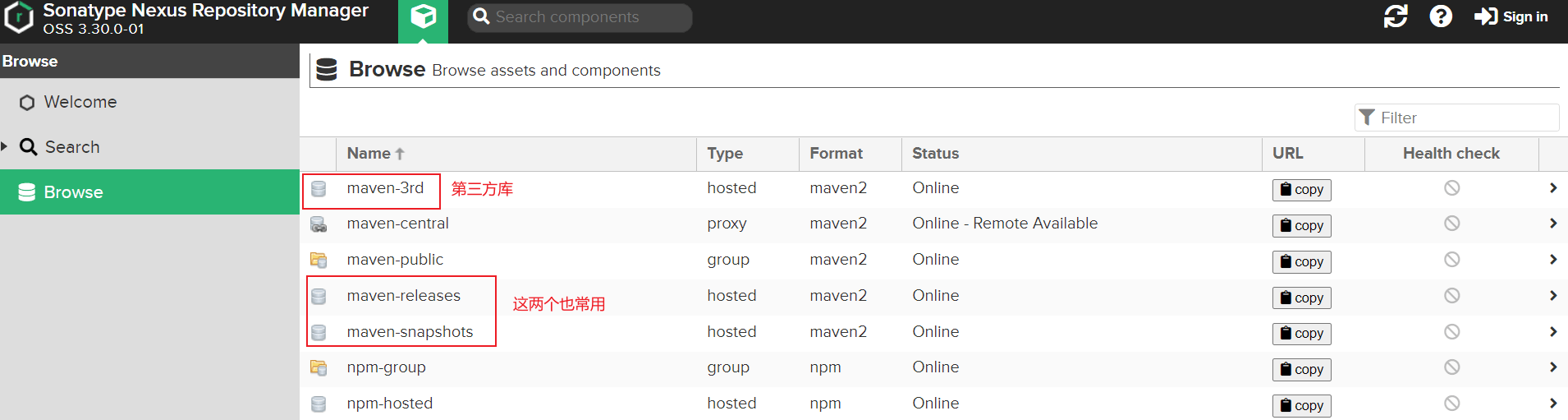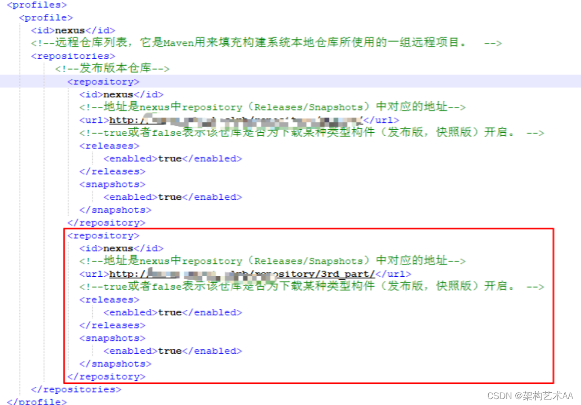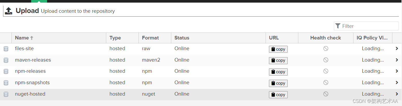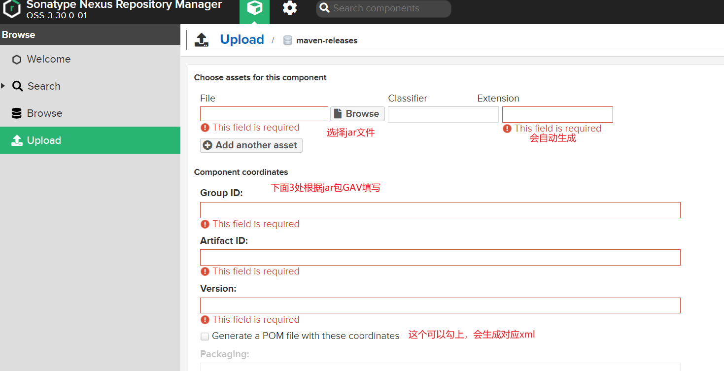 公司内部使用Nexus搭建Maven仓库,除代理阿里官方的仓库外,远程仓库中没有的组件包,比如第三方jar包,一般通过新建仓库上传到Nexus上。在maven中,配置setting.xml,之后通过mvn deploy命令可以将包传入私服  私服是一个特殊的远程仓库,它是架设在局域网内的仓库服务。私服代理广域网上的远程仓库,供局域网内的Maven用户使用。当Maven需要下载构建的使用,它先从私服请求,如果私服上没有的话,则从外部的远程仓库下载,然后缓存在私服上,再为Maven的下载请求提供服务。 ### **一、通过界面操作,将打成jar包的sdk通过Nexus可视化界面直接上传上去。** ####**第1步:选择要上传的仓库** 根据jar的性质实际情况来定,比如上传到maven-release库。  #### **第2步:上传组件** 登录nexus,右上角点击signin  左侧菜单选择Upload  右侧有对应的授权可上传部分,选择你要上传的部分,比如我这里就是上传到maven-releases  点击对应部分,到上传页面,选择对应的jar包,填写好gav,再勾选生成xml的选项,确认上传即可。  最后在Browser浏览该部分的依赖时,就能看到你当时上传的jar。 ### **二、通过命令上传** mvn deploy:deploy-file -DgroupId=net.sf -DartifactId=json-lib -Dversion=2.4 -Dpackaging=jar -Dfile=E:/json-lib-2.4.jar -Durl=http://192.168.1.222/nexus/repository/releases/ -DrepositoryId=releases *参数说明* mvn deploy:deploy-file -DgroupId=xxxxxx 就相当于pom中的groupId -DartifactId=xxxxxx 就相当于pom中的artifactId -Dversion=xxxxxx 就相当于pom中的版本号version -Dpackaging=xxxxxx 就相当于pom中打包方式 -Dfile=xxxxxx 本地环境 -Durl=xxxxxx 上传的url -DrepositoryId=xxxxxx 对应的是setting.xml 里边的id 下载,需要修改maven的setting.xml 设置repository  之后reimport即可。