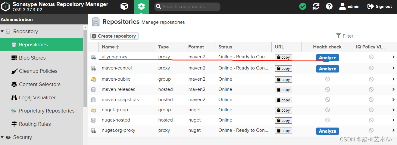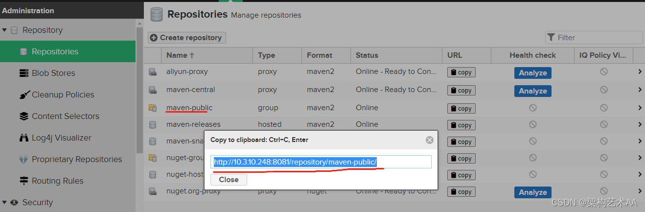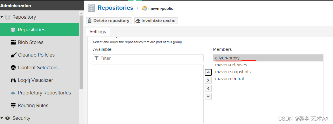 nexus官方仓库,在开发中我们可以添加国内阿里云maven仓库。 ### **1. nexus默认仓库说明** maven-central:maven 中央库,默认从 https://repo1.maven.org/maven2/ 拉取 jar maven-releases:私库发行版 jar,初次安装请将 Deployment policy 设置为 Allow redeploy maven-snapshots:私库快照(调试版本)jar maven-public:仓库分组,把上面三个仓库组合在一起对外提供服务,在本地 maven 基础配置 settings.xml 或项目 pom.xml 中使用 ### **2. nexus仓库类型说明** group:这是一个仓库聚合的概念,用户仓库地址选择 Group 的地址,即可访问 Group 中配置的,用于方便开发人员自己设定的仓库。 maven-public 就是一个 Group 类型的仓库,内部设置了多个仓库,访问顺序取决于配置顺序,3.x 默认为 Releases、Snapshots、Central,当然你也可以自己设置。 hosted:私有仓库,内部项目的发布仓库,专门用来存储我们自己生成的 jar 文件 snapshots:本地项目的快照仓库 releases: 本地项目发布的正式版本 proxy:代理类型,从远程中央仓库中寻找数据的仓库(可以点击对应的仓库的 Configuration 页签下 Remote Storage 属性的值即被代理的远程仓库的路径),如可配置阿里云 maven 仓库 central:中央仓库 ### **3. 创建repository** 配置阿里云的代理仓库,在maven客户端下载maven依赖后,nexus私服如果不存在的话,会从阿里云私服下载,然后缓存到本地的私服,下载maven客户端下载依赖后,就可以从本地nexus私服拉取依赖。 同时自己开发的服务,可以deploy到本地nexus私服   配置参数: Name: maven-aliyun aliyun-url: http://maven.aliyun.com/nexus/content/groups/public/ Cache统一设置为200天 288000 设置私用仓库可重复发布(可选) Nexus安装后自带maven-releases,maven-snapshots两个仓库,用于将生成的jar包发布在这两个仓库中,在实际开发中需要将maven-releases设置为可以重复发布 其他保持默认 点击,保存  配置 mavne-public 加入列表并配置新加的proxy的顺序  可重复添加多个 1. aliyun http://maven.aliyun.com/nexus/content/groups/public 2. gradle https://plugins.gradle.org/m2/ 2. apache_snapshot https://repository.apache.org/content/repositories/snapshots/ 3. apache_release https://repository.apache.org/content/repositories/releases/ 4. atlassian https://maven.atlassian.com/content/repositories/atlassian-public/ 5. central.maven.org http://central.maven.org/maven2/ 6. datanucleus http://www.datanucleus.org/downloads/maven2 7. maven-central (安装后自带,仅需设置Cache有效期即可) https://repo1.maven.org/maven2/ 8. nexus.axiomalaska.com http://nexus.axiomalaska.com/nexus/content/repositories/public 9. oss.sonatype.org https://oss.sonatype.org/content/repositories/snapshots 10.pentaho https://public.nexus.pentaho.org/content/groups/omni/ 复制maven nexus 地址  通过 pom.xml 文件配置新的仓库 <repositories> <repository> <id>maven-nexus</id> <name>maven-nexus</name> <url>http://10.3.10.248:8081/repository/maven-public/</url> <releases> <enabled>true</enabled> </releases> <snapshots> <enabled>true</enabled> </snapshots> </repository> </repositories> 原文地址:https://blog.csdn.net/LG_15011399296/article/details/125083847