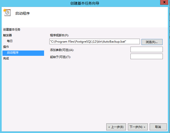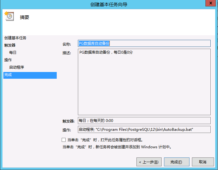 ### 一、数据备份 pg_dump -h 127.0.0.1 -U postgres iportal > D:\iportal-230221.bak ### 二、数据恢复 psql.exe -h 127.0.0.1 -U postgres -d iportal < D:\iportal-230221.bak ### 三、自动备份脚本(Windows) #### **1、编写备份脚本** @ECHO OFF @setlocal enableextensions @cd /d "%~dp0" SET PGPASSWORD=thth@1212 SET SVPATH=D:\DataBack\ SET PRJDB=iportal SET DBUSR=postgres SET DirName=%date:~0,4%%date:~5,2% @if %date:~8,2% == 01 (md "%SVPATH%%DirName%") @if not exist "%SVPATH%%DirName%" (md "%SVPATH%%DirName%") SET DBDUMP=%PRJDB%_%date:~0,4%%date:~5,2%%date:~8,2%_%time:~1,1%%time:~3,2%%time:~6,2%.bak @ECHO OFF pg_dump -h localhost -U postgres %PRJDB% > %SVPATH%%DirName%\%DBDUMP% echo 数据库备份完成,存放路径:%SVPATH%%DirName%\%DBDUMP% @ECHO ON 效果图如下:  [AutoBackup.bat](/api/file/getAttach?fileId=63f463099a54ae02220000f9) #### **2、创建"任务计划程序"** **(1) 打开“管理工具” $\rightarrow$ “任务计划程序”,如下图所示:**  **(2) 创建基本任务向导,按每日0时0分执行,如下图所示:**